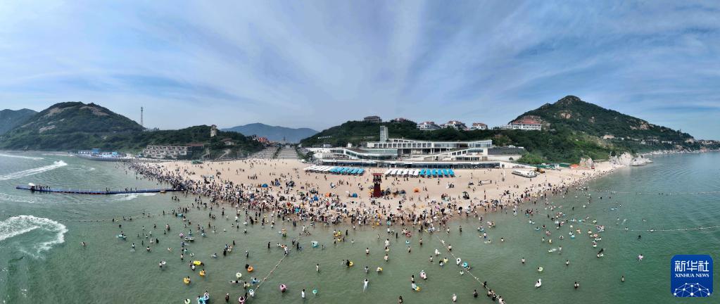 6月23日,游客在江蘇省連云港市連島大沙灣海濱浴場(chǎng)戲水納涼(無(wú)人機全景照片)。