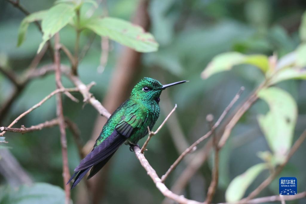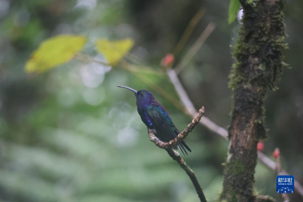 7月24日,哥斯達黎加蒙特韋德云霧森林生物保護區的一只紫刀翅蜂鳥(niǎo)停在林中。新華社記者 范小林 攝