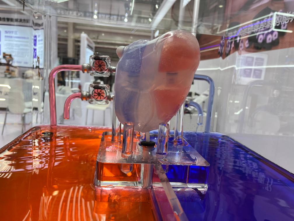 機器人足夠“剛”,卻也可以很柔軟。在博覽會(huì )現場(chǎng),一顆放置在容器中、正在跳動(dòng)的人工心臟讓觀(guān)眾驚嘆不已。這顆人工心臟大概是人類(lèi)心臟的兩倍大,具有與自然心臟相似的內腔結構,動(dòng)力室外接控制器,通過(guò)膨脹和收縮改變心室的體積,影響血液壓力,實(shí)現血液的流入和流出。