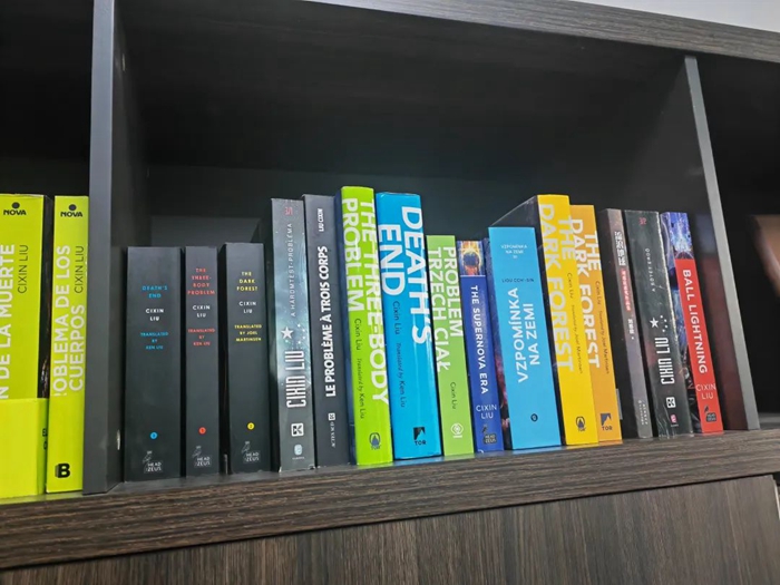 在陽(yáng)泉劉慈欣工作室內擺放的多種語(yǔ)言譯本。新華社記者 王皓 攝