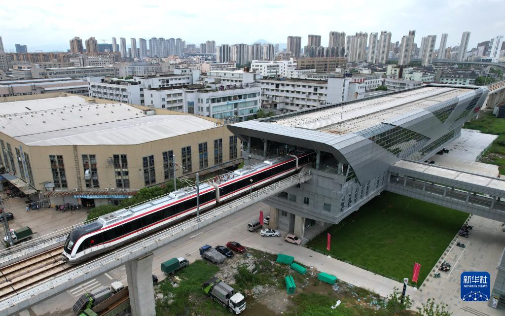 8月26日,溫州軌道交通S2線(xiàn)列車(chē)駛出瑞安市上東路站(無(wú)人機照片)。新華社發(fā)(莊穎昶 攝)