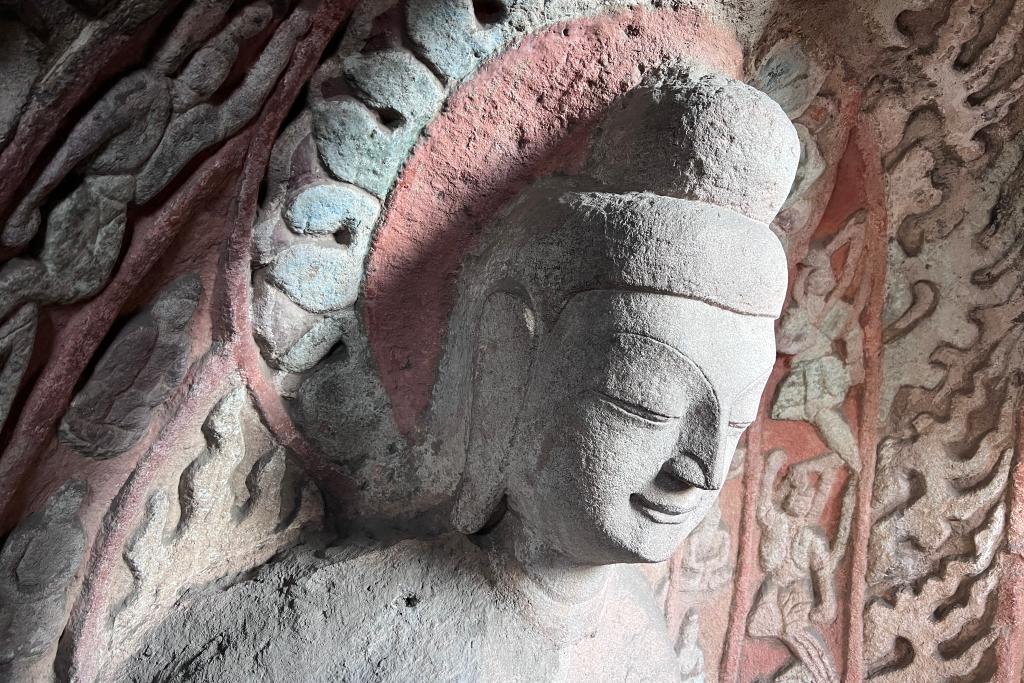細目低垂、清秀典雅,眉如彎月、舒緩柔和——第5窟閣樓東側第二層的角落里,隱藏著(zhù)一尊“云岡最美佛像”,超然一笑,慈悲盡顯?!斑@樣一尊線(xiàn)條精美流暢的佛陀造像,宛如沉靜的蓮花,微笑中飽含著(zhù)睿智與寬容?!痹茖芯吭嚎脊潘奈镄迯褪腋敝魅畏蛘f(shuō)。