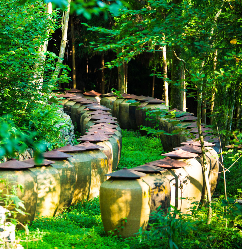 幽靜蔥蘢的山林間,數千個(gè)巨大陶壇錯落掩映于竹林,極富“中國式酒莊”的浪漫感。酒莊負責人告訴《瞭望東方周刊》,天臺山林間避光、恒溫、高濕、富氧,酒體在陶壇中可與優(yōu)質(zhì)空氣交換,持續氧化,有利于微生物菌群持續生長(cháng)和酯化,“將天地靈氣集于一壇”。