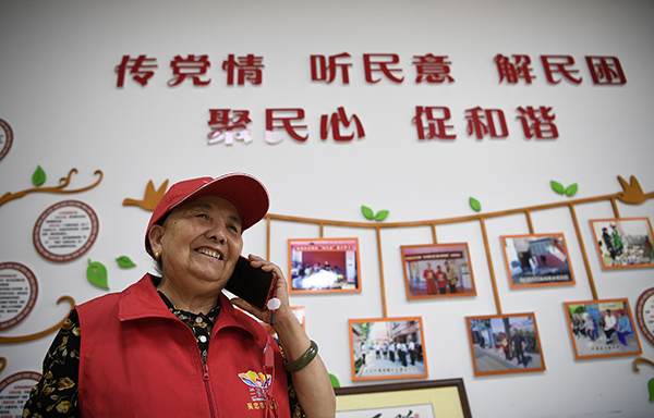 圖為王蘭花在社區工作站與居民通電話(huà)