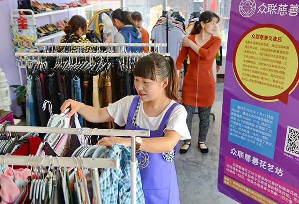 圖為河北衡水市桃城區眾聯(lián)慈善義賣(mài)店店員在整理熱心市民送來(lái)的衣物