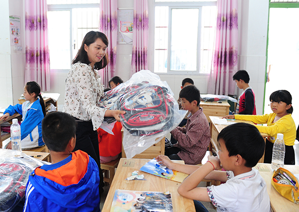 圖為蘇明娟給母校金寨三合實(shí)驗學(xué)校的學(xué)生們發(fā)放禮物