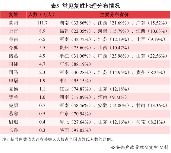 復姓“歐陽(yáng)”33.86%的人口分布在湖南;復姓“皇甫”32.72%的人口分布在河南;復姓“諸葛”31.06%的人口分布在浙江;復姓“司徒”88.19%的人口分布在廣東;復姓“司馬”30.28%的人口分布在河南;復姓“夏侯”74.87%的人口分布在江西。
