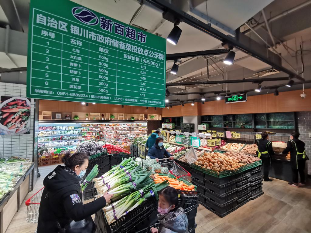 大白菜每斤0.92元、土豆每斤1.03元、鮮羊肉每斤34元……在寧夏回族自治區銀川市新百連超老大樓店,綠色的公示牌上明確標示著(zhù)政府儲備肉菜價(jià)格。顧客們推著(zhù)購物車(chē)穿梭在貨架之間,不時(shí)停下來(lái)買(mǎi)塊肉,或是挑揀蔬菜??吹侥膫€(gè)貨架上的貨物少了,超市工作人員便會(huì )手腳麻利地補貨。