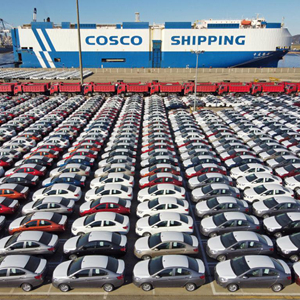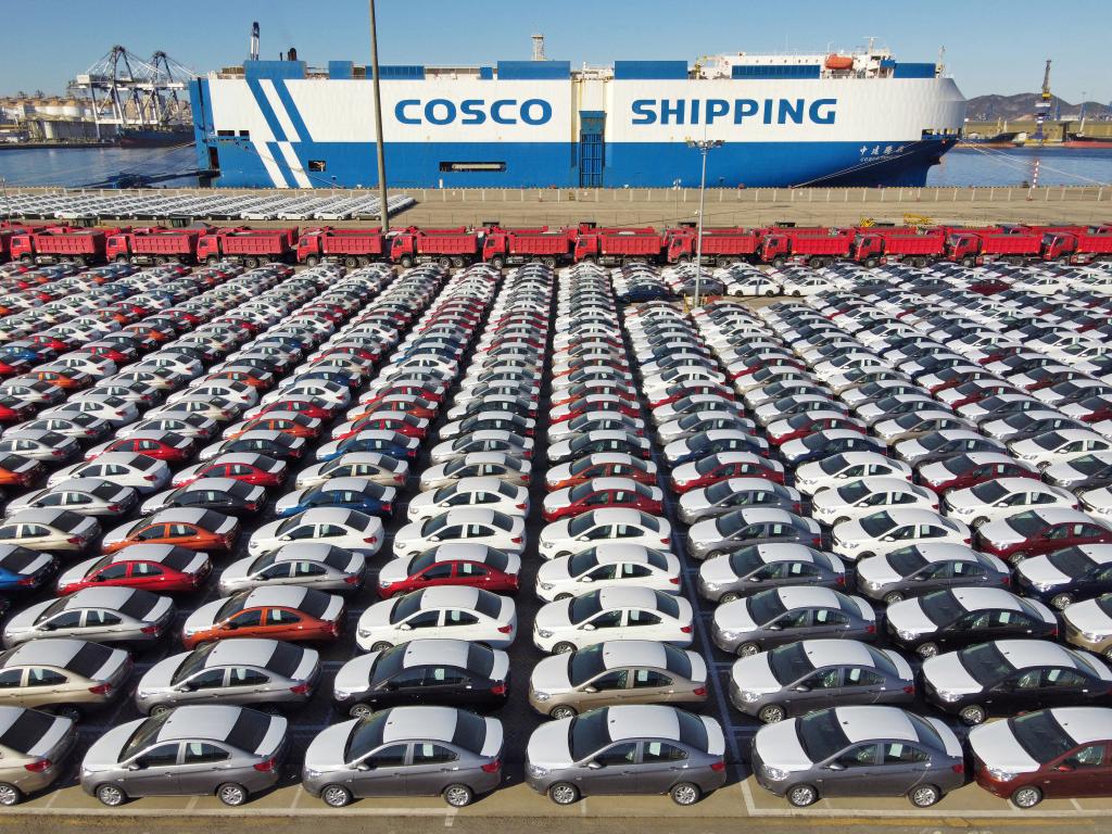 大批出口商品車(chē)在山東港口煙臺港集結等待裝船(2021年12月7日攝,無(wú)人機照片)。 新華社發(fā)(唐克 攝)