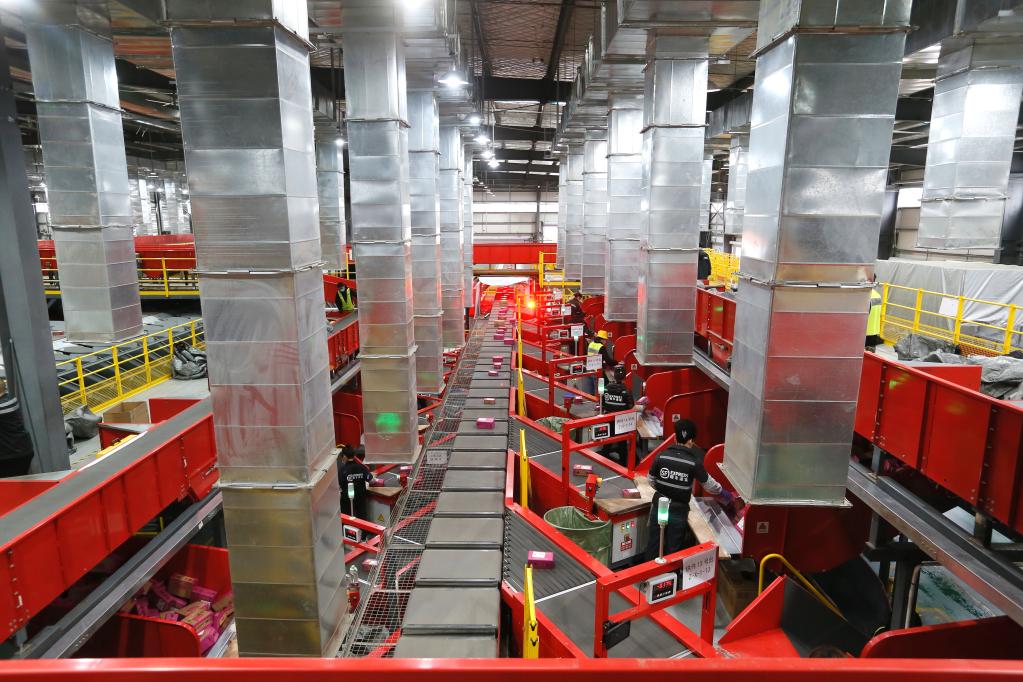2021年11月7日,在青島順豐華駿分撥中心,全自動(dòng)智能分揀系統分揀包裹。新華社發(fā)(梁孝鵬 攝)