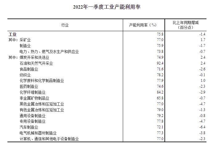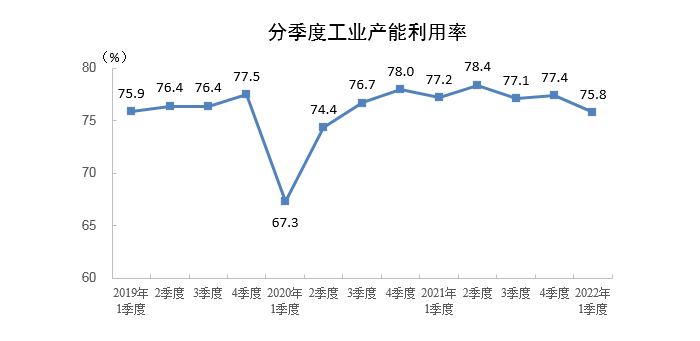 ????一季度,全國工業(yè)產(chǎn)能利用率為75.8%,比上年同期下降1.4個(gè)百分點(diǎn),與2019年一季度基本持平。