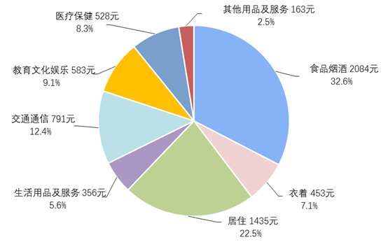 一季度,全國居民人均食品煙酒消費支出2084元,增長(cháng)4.9%,占人均消費支出的比重為32.6%;人均衣著(zhù)消費支出453元,增長(cháng)3.6%,占人均消費支出的比重為7.1%;人均居住消費支出1435元,增長(cháng)6.7%,占人均消費支出的比重為22.5%;人均生活用品及服務(wù)消費支出356元,增長(cháng)4.8%,占人均消費支出的比重為5.6%;人均交通通信消費支出791元,增長(cháng)12.7%,占人均消費支出的比重為12.4%;人均教育文化娛樂(lè )消費支出583元,增長(cháng)6.9%,占人均消費支出的比重為9.1%;人均醫療保健消費支出528元,增長(cháng)9.1%,占人均消費支出的比重為8.3%;人均其他用品及服務(wù)消費支出163元,增長(cháng)17.1%,占人均消費支出的比重為2.5%。