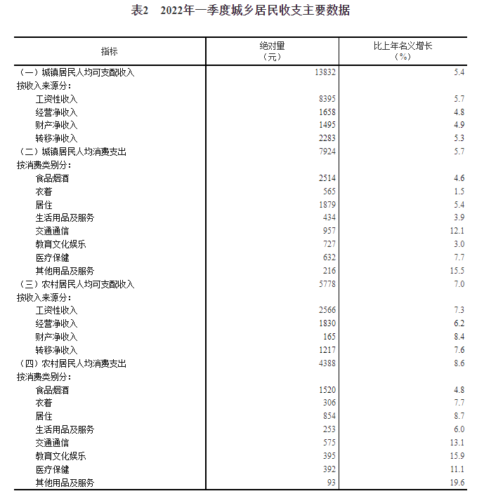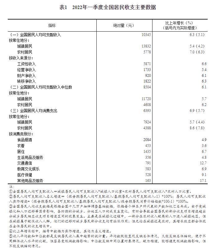 一季度,全國居民人均可支配收入10345元,比上年名義增長(cháng)6.3%,扣除價(jià)格因素,實(shí)際增長(cháng)5.1%。分城鄉看,城鎮居民人均可支配收入13832元,增長(cháng)(以下如無(wú)特別說(shuō)明,均為同比名義增長(cháng))5.4%,扣除價(jià)格因素,實(shí)際增長(cháng)4.2%;農村居民人均可支配收入5778元,增長(cháng)7.0%,扣除價(jià)格因素,實(shí)際增長(cháng)6.3%。