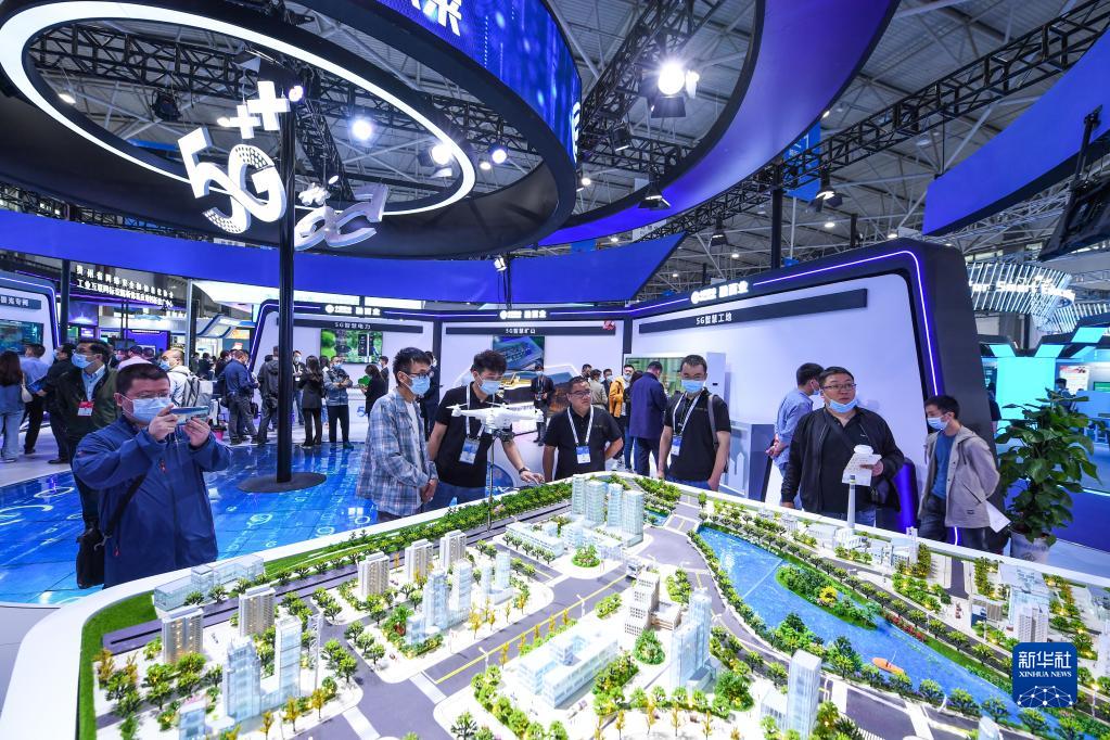 參會(huì )者在2021中國國際大數據產(chǎn)業(yè)博覽會(huì )上參觀(guān)5G智慧城市模型(2021年5月26日攝)。新華社記者 楊文斌 攝