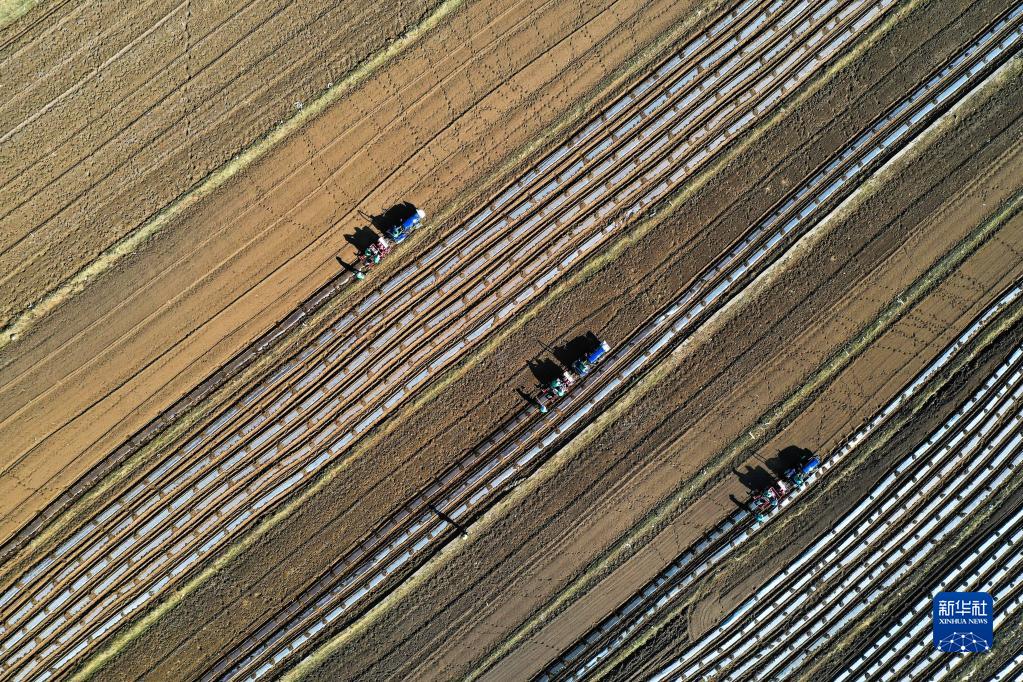 在貴州省威寧縣雙龍鎮涼山社區的眾果農機社會(huì )化服務(wù)基地,農民駕駛馬鈴薯自動(dòng)播種機在播種(3月8日攝,無(wú)人機照片)。新華社記者 楊文斌 攝