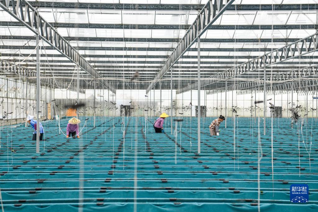 農民在貴州省龍里縣灣灘河鎮園區村的人工智能調控大棚內管護黃瓜苗(3月19日攝)。新華社記者 楊文斌 攝