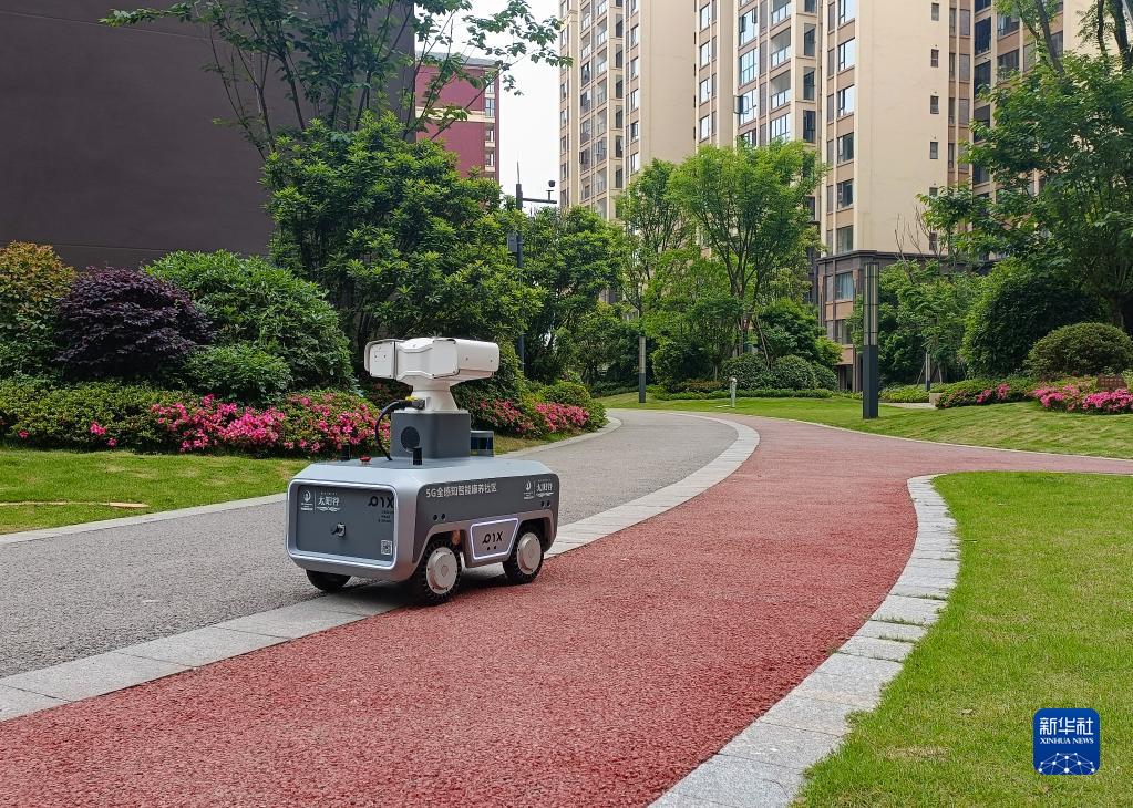 貴州省龍里縣中鐵國際生態(tài)城太陽(yáng)谷5G全感知智能康養社區內的無(wú)人駕駛安防車(chē)在運行中(5月23日攝)。新華社記者 劉續 攝