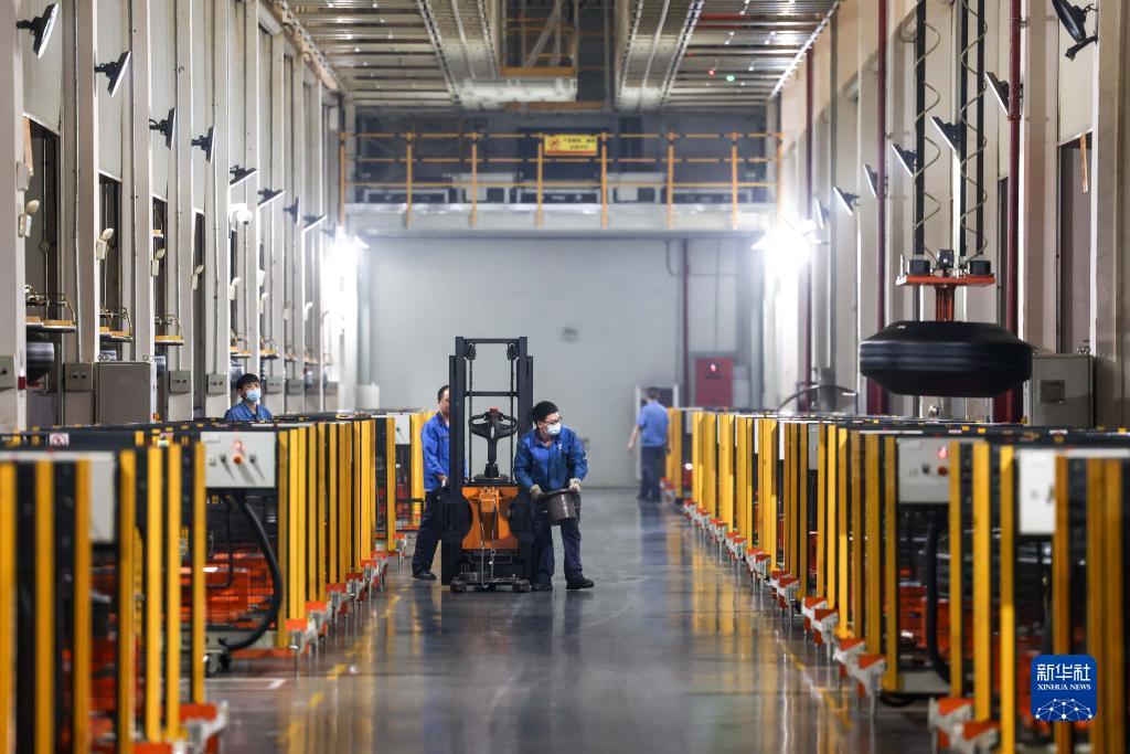 AGV無(wú)人搬運小車(chē)在貴州輪胎股份有限公司“5G全連接工廠(chǎng)”的部件生產(chǎn)區內工作 (5月17日攝)。新華社記者 歐東衢 攝