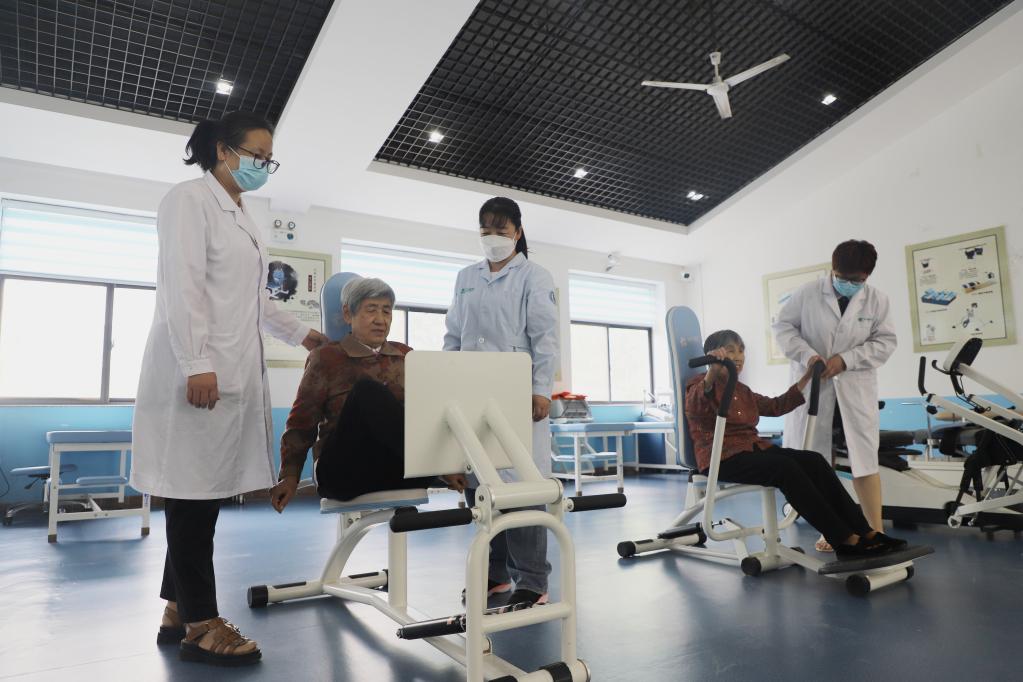 5月27日,在山東省博興縣呂藝鎮老年公寓醫養康復中心,醫護人員指導農村老人利用專(zhuān)業(yè)器械進(jìn)行康復鍛煉。(博興縣委宣傳部供圖)