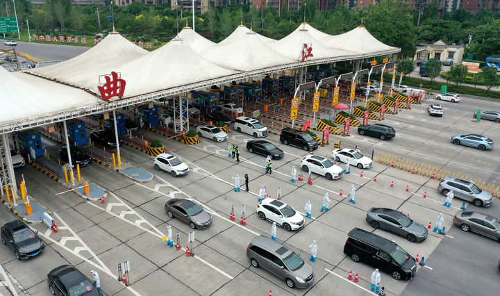在西安繞城高速曲江收費站,車(chē)輛有序通行(5月21日攝,無(wú)人機照片)。新華社記者 劉瀟 攝