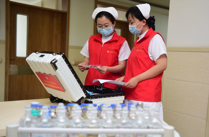 6月15日,滄州市人民醫院腫瘤院區的護士整理醫療用品,準備進(jìn)行上門(mén)護理服務(wù)。 新華社發(fā)(傅新春 攝)