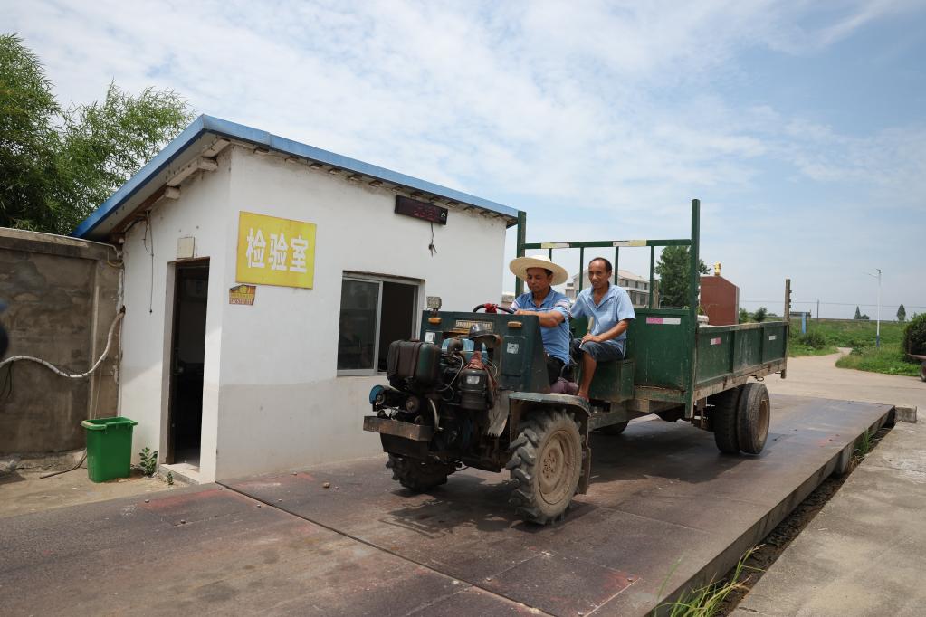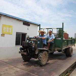 吳鋒高(左)與江新華將收到的稻谷運到米廠(chǎng)稱(chēng)重并接受食品安全檢測。新華社記者 薛宇舸攝