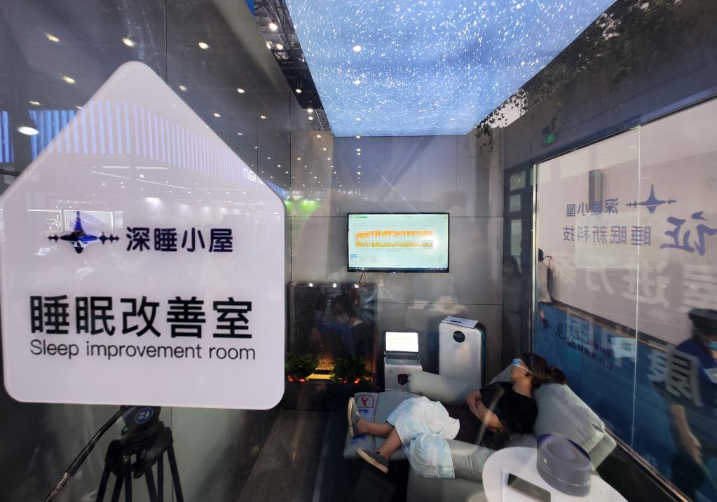 觀(guān)眾在體驗“深睡小屋”,屋內的設備用于改善睡眠質(zhì)量。新華社記者郭程 攝