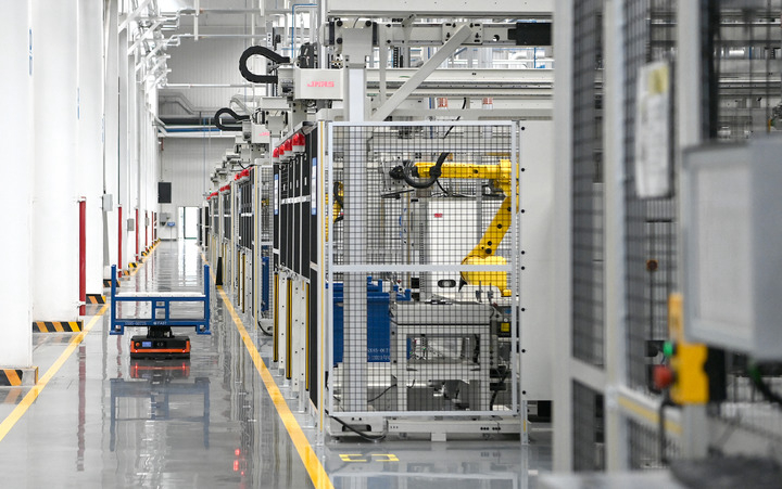 法士特西安高智新公司變速器零件數字化生產(chǎn)線(xiàn),智慧物流小車(chē)在進(jìn)行物品運輸。新華社記者劉瀟攝于2022年4月21日