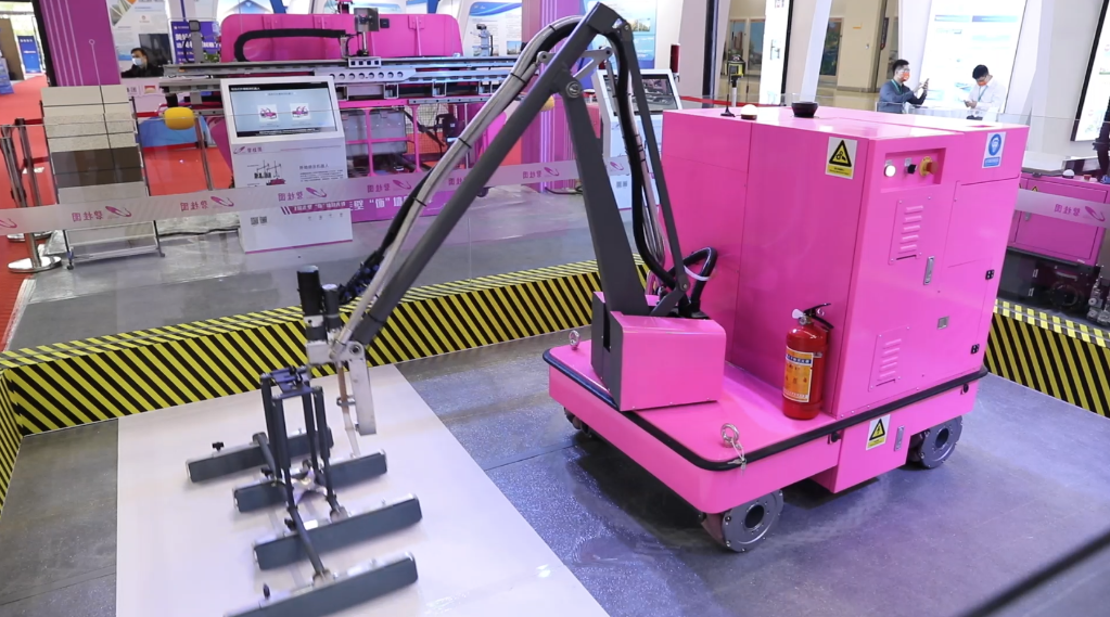 在一家企業(yè)的展區里,一臺粉紅色機器人正在進(jìn)行模擬作業(yè)。這是企業(yè)開(kāi)發(fā)的地坪漆涂敷機器人。在它的旁邊,還有外墻噴涂機器人、膩子涂敷機器人等。