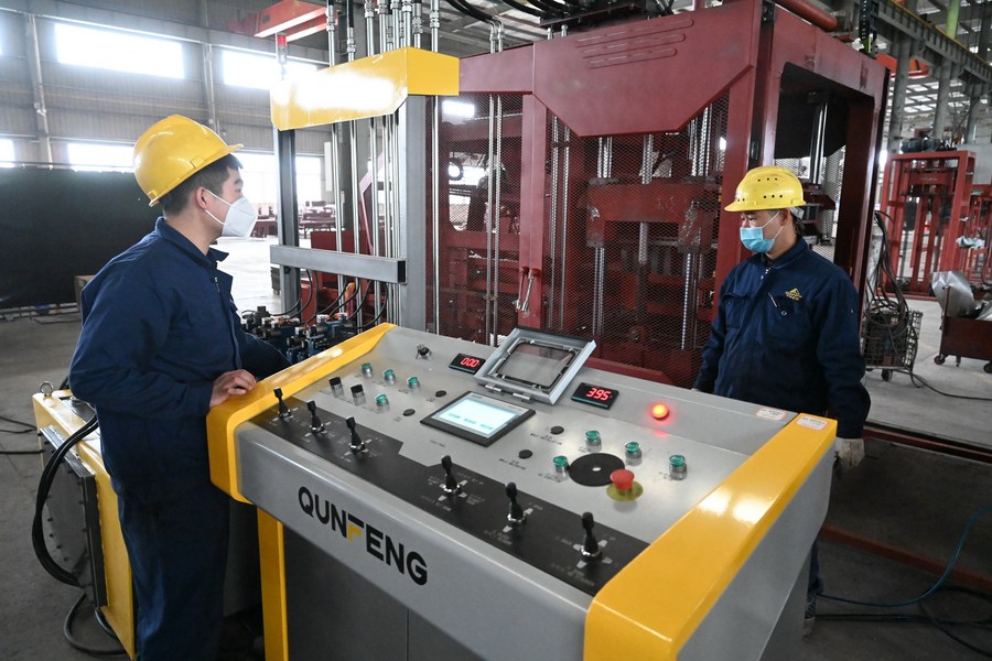 福建泉工股份有限公司工作人員加工生產(chǎn)銷(xiāo)往海外的全自動(dòng)砌塊成型機零件(12月14日攝)。新華社記者 林善傳 攝