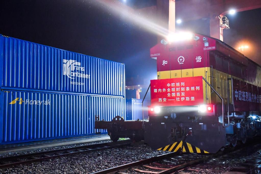 夜色中開(kāi)行的中歐班列長(cháng)安號。(西安國際陸港多式聯(lián)運有限公司供圖)