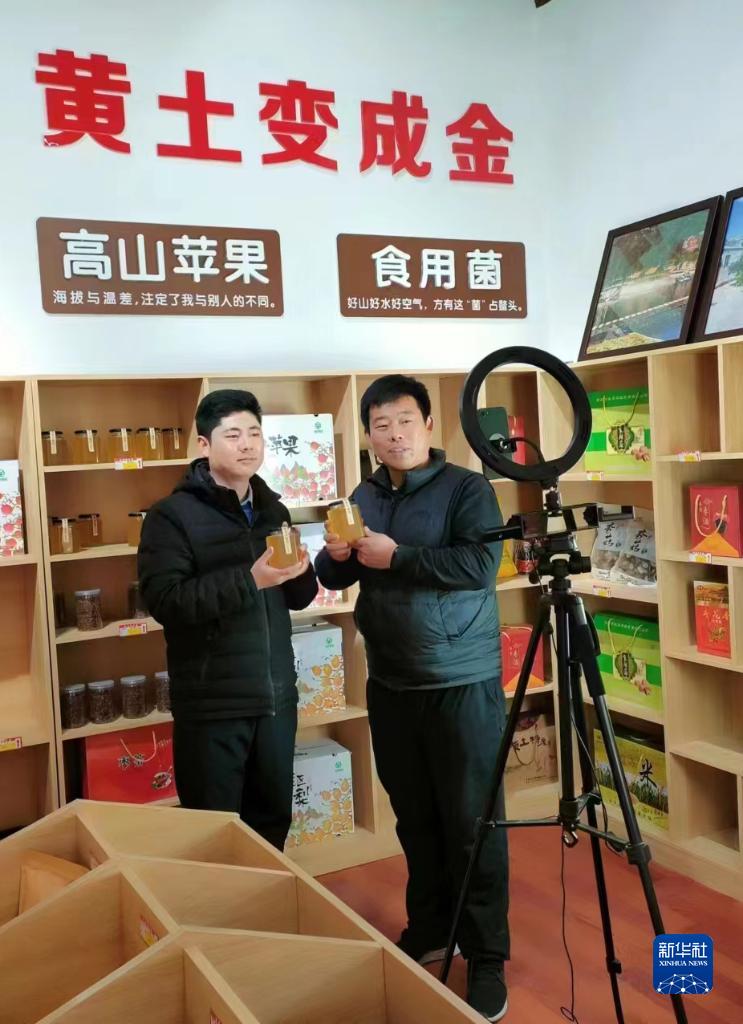 2022年11月6日,在河北省阜平縣顧家臺村的電商直播間,顧家臺村第一批返鄉創(chuàng )業(yè)的“90后”青年顧騰飛(右)在直播賣(mài)貨。新華社發(fā)(曹建平 攝)