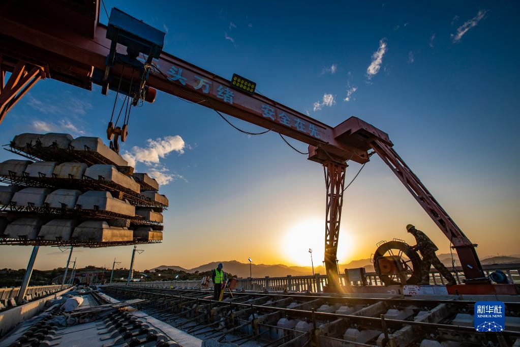 工人在新建福(州)廈(門(mén))鐵路湄洲灣跨海大橋施工(2022年4月8日攝)。新華社記者 周義 攝