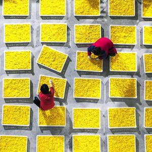 村民在貴州省貴定縣云霧鎮一菊花加工車(chē)間攤晾金絲皇菊(2022年10月20日攝,無(wú)人機照片)。新華社記者 楊文斌 攝