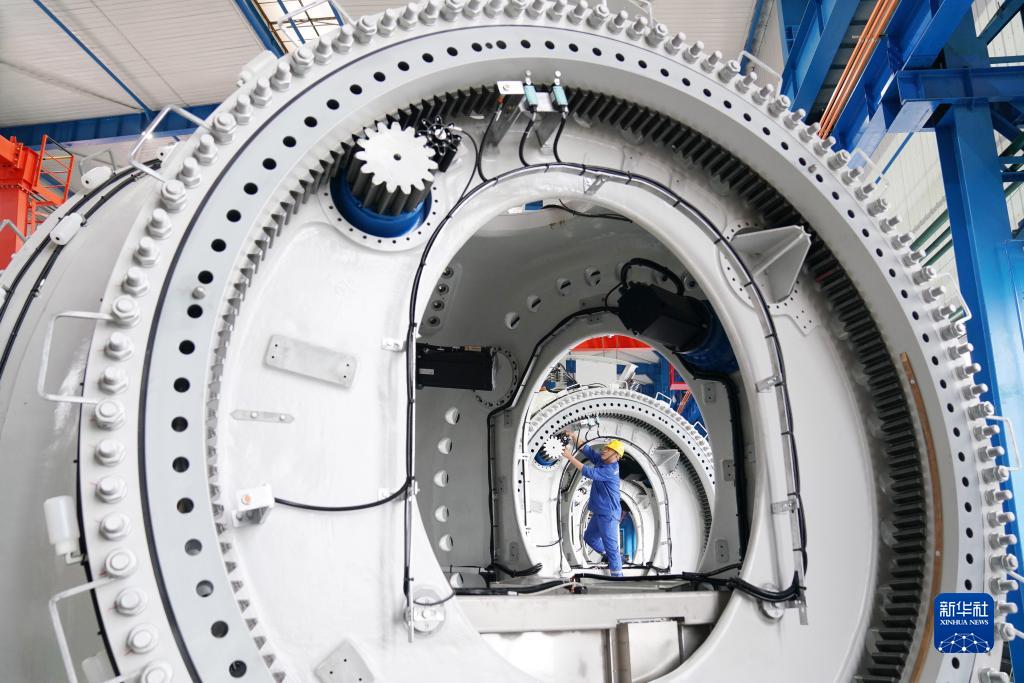 在黑龍江省齊齊哈爾市中國一重集團有限公司風(fēng)電裝備生產(chǎn)制造廠(chǎng)生產(chǎn)車(chē)間,工人進(jìn)行生產(chǎn)作業(yè)(2021年7月1日攝)。新華社記者 王建威 攝