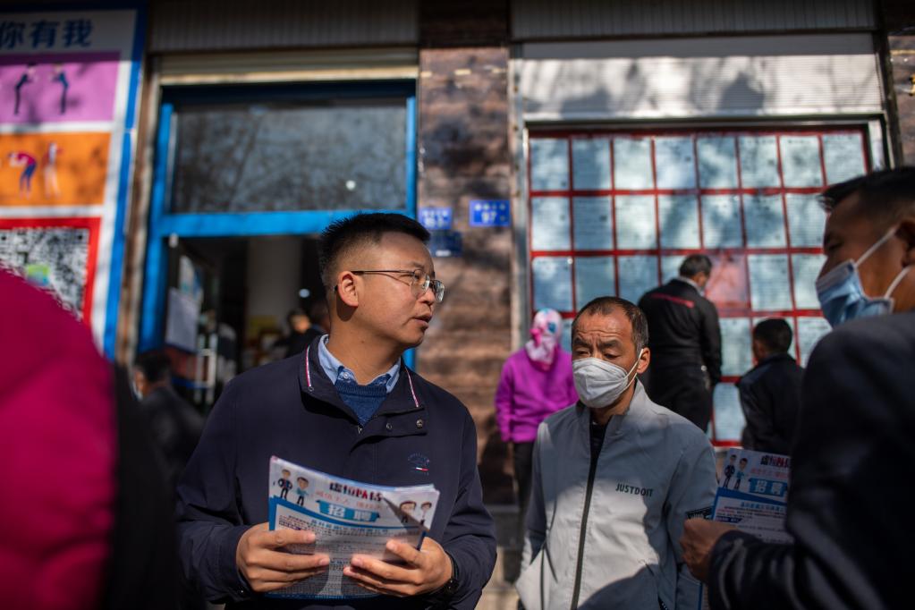2月12日,袁海波(左一)在人才市場(chǎng)向務(wù)工人員發(fā)放就業(yè)宣傳單。新華社記者江文耀 攝
