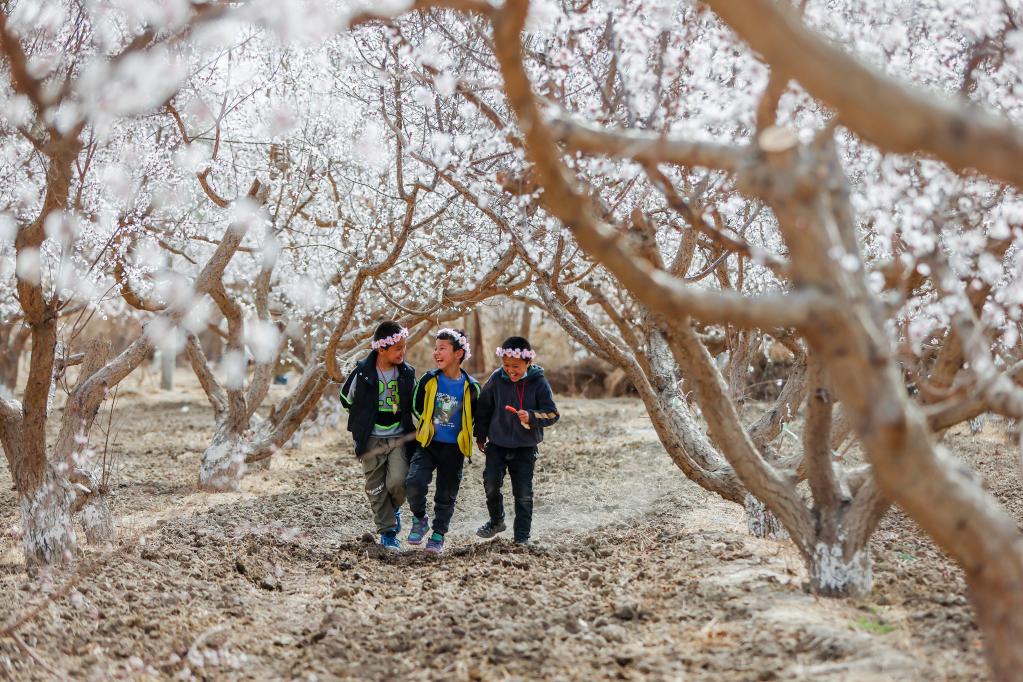 3月18日,小朋友在“新疆第一春·花開(kāi)吐魯番”2023吐魯番杏花節現場(chǎng)游玩。新華社記者 郝昭 攝