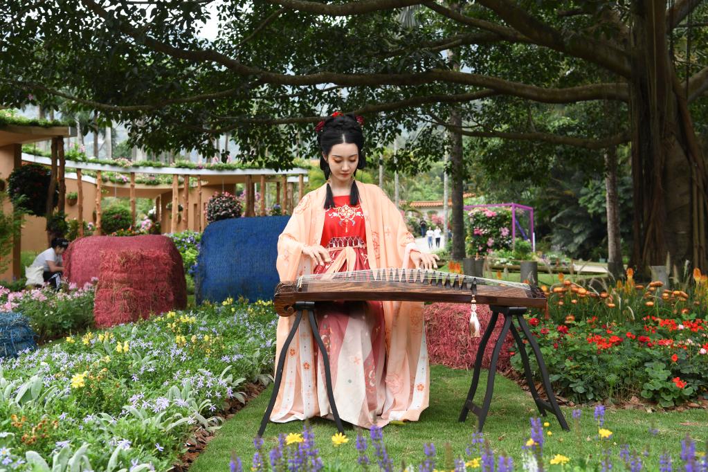4月8日,一名女子在2023粵港澳大灣區花展現場(chǎng)進(jìn)行民樂(lè )表演。新華社記者梁旭 攝
