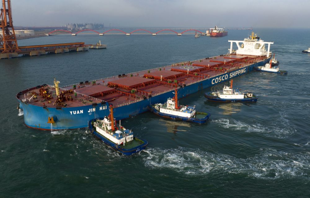 一艘輪船在拖輪的協(xié)助下向河北港口集團唐山港曹妃甸港區礦石碼頭靠泊(2022年9月10日攝,無(wú)人機照片)。新華社記者 楊世堯 攝