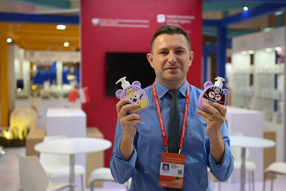在第三屆中國—中東歐國家博覽會(huì )暨國際消費品博覽會(huì )中東歐展館,企業(yè)代表展示來(lái)自波蘭的日用消費品(5月16日攝)。新華社記者 黃宗治 攝