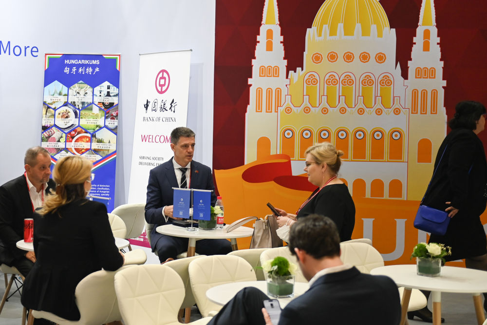 外國企業(yè)代表在第三屆中國—中東歐國家博覽會(huì )暨國際消費品博覽會(huì )中東歐展館洽談(5月16日攝)。新華社記者 黃宗治 攝