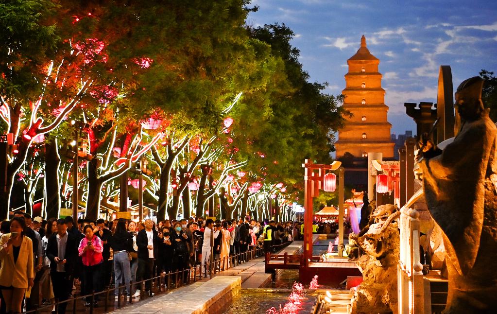 游客在西安大唐不夜城游覽(5月8日攝)。新華社發(fā)(鄒競一 攝)