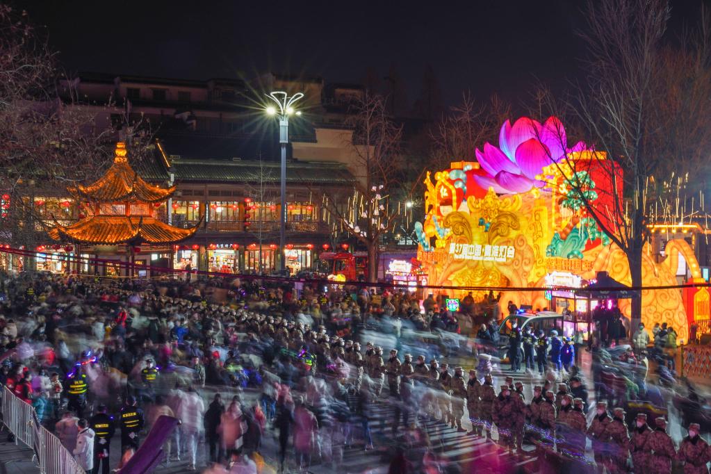 游客在南京夫子廟景區觀(guān)景賞燈(2月4日攝)。新華社記者李博 攝