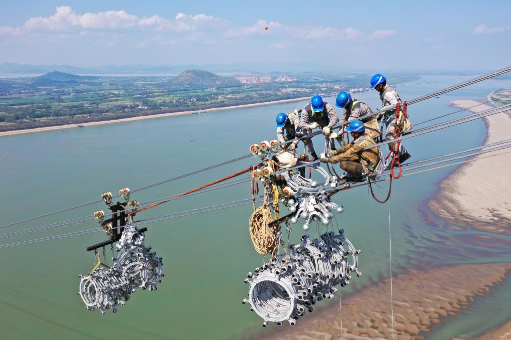 2022年9月13日,工人在白鶴灘-浙江±800千伏特高壓直流輸電線(xiàn)路工程(重慶段)江津長(cháng)江大跨越施工現場(chǎng)作業(yè)。