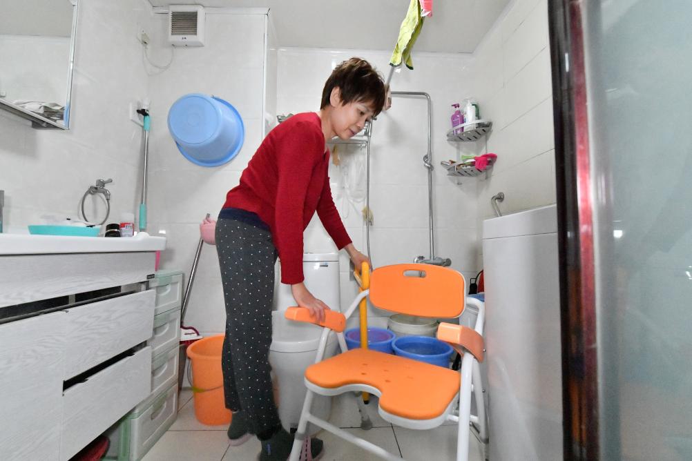 10月17日,在天津市河西區尖山街道,居民在家中衛生間內擺放助浴椅、防滑扶手等適老化改造設施。新華社記者孫凡越 攝