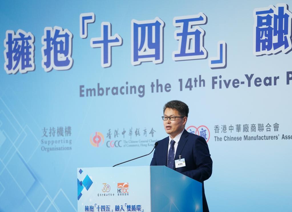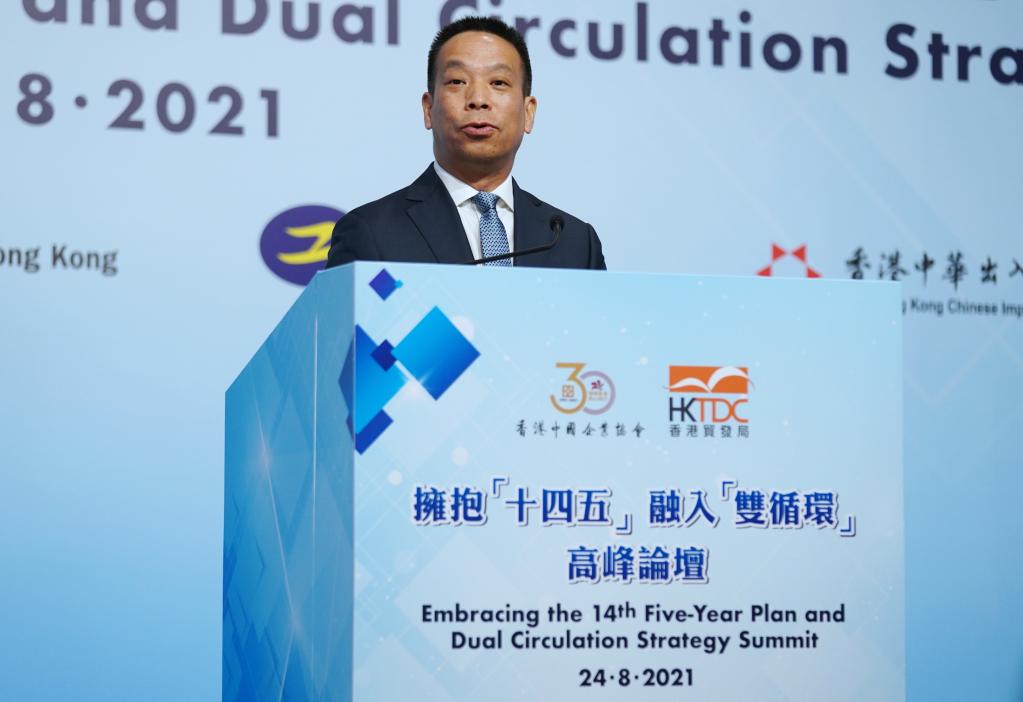 作為國家“十四五”規劃宣講團在港系列宣講活動(dòng)的重要組成部分,“擁抱‘十四五’ 融入‘雙循環(huán)’”高峰論壇24日在香港會(huì )展中心舉行,由香港中國企業(yè)協(xié)會(huì )和香港貿發(fā)局主辦。來(lái)自香港工商界、學(xué)術(shù)界、外國商會(huì )和外資企業(yè)代表,以及中企協(xié)會(huì )會(huì )員代表等300余人與會(huì )。林建岳出席論壇開(kāi)幕式時(shí)發(fā)表上述致辭。