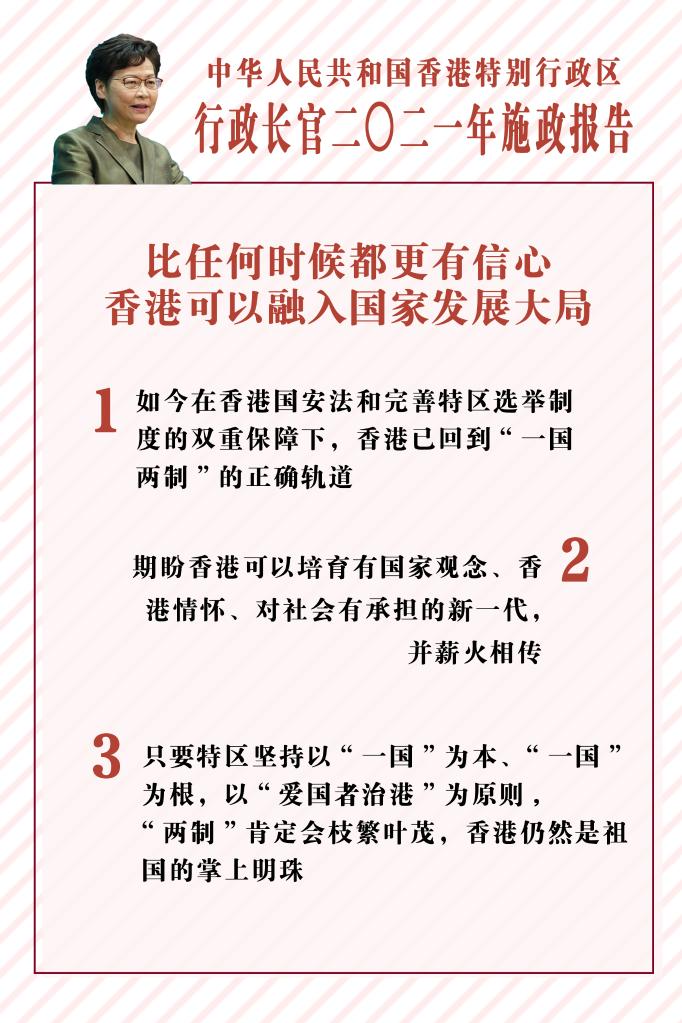 “今天,我比任何時(shí)候都對香港更有信心、更肯定香港可以融入國家發(fā)展大局,在國家邁向第二個(gè)百年奮斗目標的進(jìn)程中,發(fā)揮不可替代的作用?!绷粥嵲露鹪诮Y語(yǔ)中說(shuō),只要特區堅持以“一國”為本、“一國”為根,以“愛(ài)國者治港”為原則,“兩制”肯定會(huì )枝繁葉茂,香港仍然是祖國的掌上明珠。(海報制作:龍鏡伊 蔣佳璇 譚佳銘 林杉)