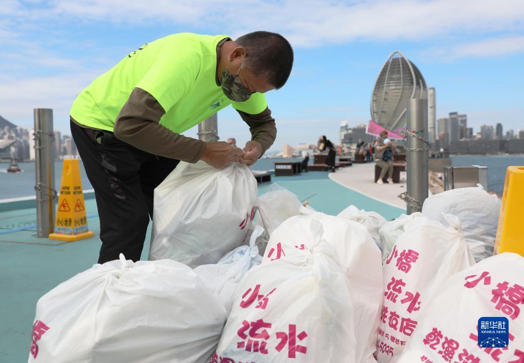 貓哥冼力求在整理垃圾袋(2021年12月7日攝)。新華社記者 吳曉初 攝
