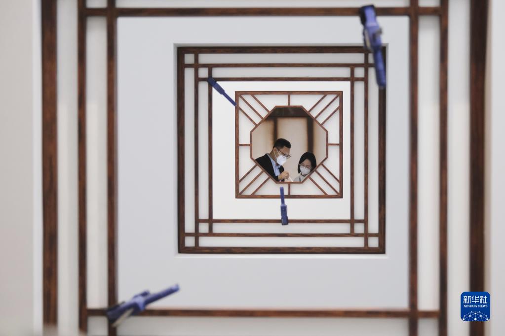 2022年4月22日,香港故宮文化博物館藏品修復專(zhuān)家梁嘉放(右)和呂智超在展廳內工作。 新華社記者 王申 攝