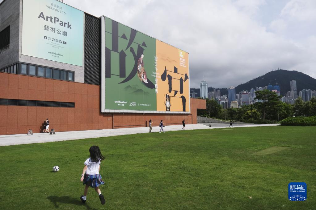 2022年6月17日,女孩在香港故宮文化博物館旁的草坪上玩耍。 新華社記者 王申 攝